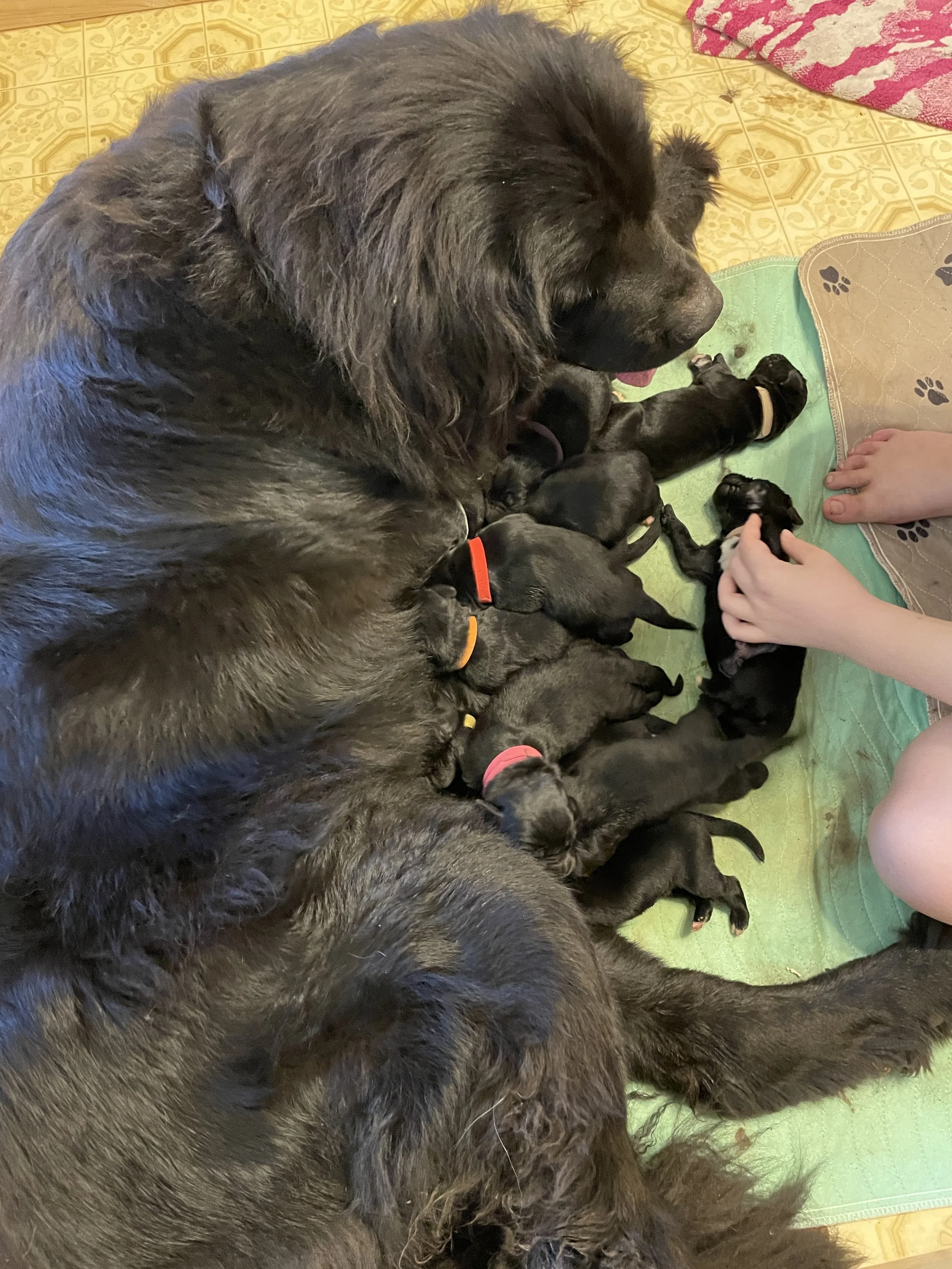 Newfoundland puppy Clementine enjoying a belly rub