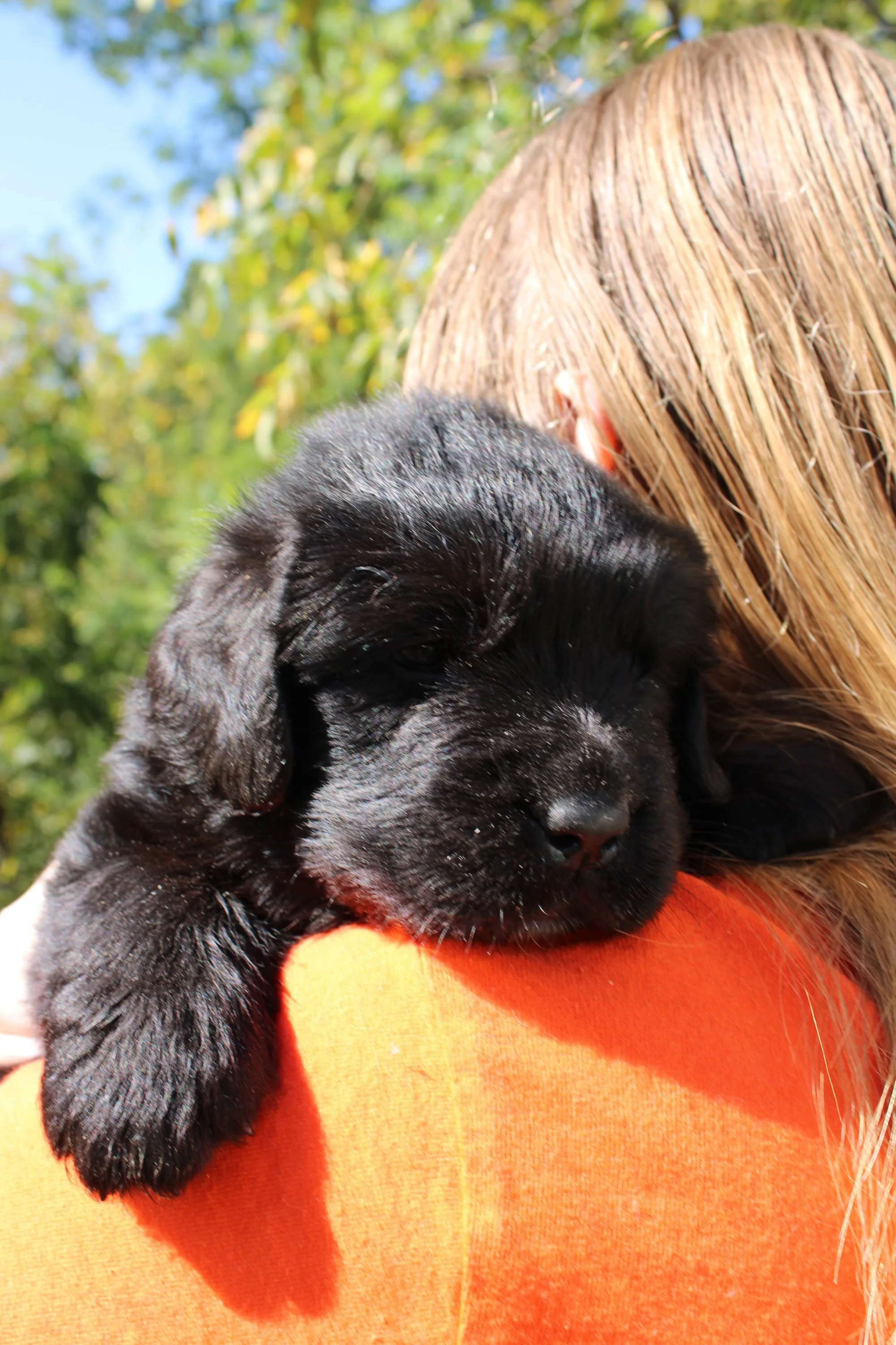 Newfoundland puppy being held by our daughter
